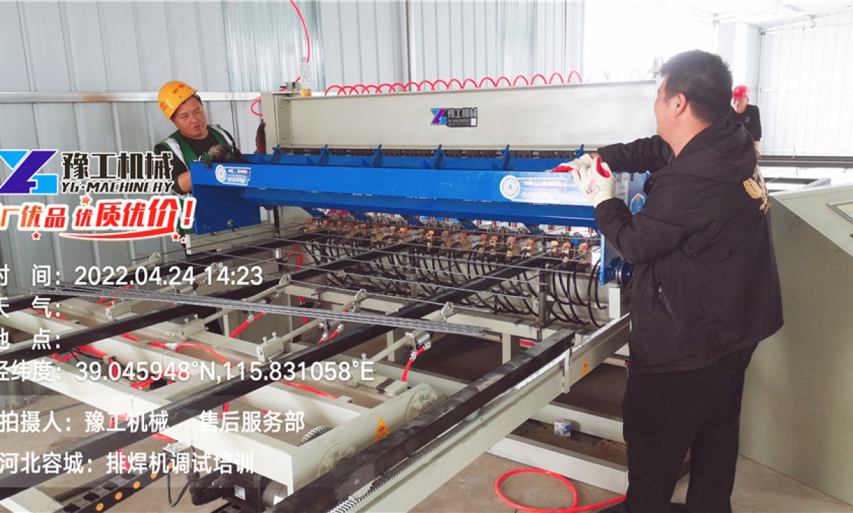 中鐵十一局雄安新區容西市政工程建設項目,客戶需要制作寬2米,長6米,鋼絲直徑6-8mm,20個焊點的鋼筋網片,用于批量的建筑用鋼筋網片焊接??蛻艟暮Y選了4個廠家,提供設備方案,最終選擇豫工,是對我們專業能力和高性價比施工方案的高度認可。針對客戶的施工要求,產品經理并沒有推薦最高配置的排焊設備,而是提供了最適合客戶需求的高性價比設備方案:半自動氣動鋼筋網片排焊機+2立方左右空壓機+豫工17年經驗的專業服務,因為這份想客戶之所想的合作誠意,最終贏得客戶青睞。試機過程中,設備通過氣動下壓的焊接方式,焊接壓力均勻,焊點牢固、穩定,焊接速度快,可以達到40排/分鐘。