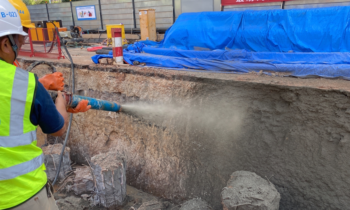 湖南長沙地鐵站項目,由中國建筑五局承建,訂購液壓濕噴機主要用于基坑支護,總施工面積100000平,為保證工期,客戶要求單日噴漿面積達到1000平方,水平輸送距離達到50米。根據客戶工程需求,產品經理為客戶推薦YG-90型單噴頭液壓濕噴機,配套豫工電動16立方空氣壓縮機。液壓濕噴機采用骨料粒徑15mm的漿料,在16立方電動空壓機的完美配合下,高效噴漿,每小時噴漿量達到7m3,輸送距離輕松達到50米,完全滿足客戶施工需求。